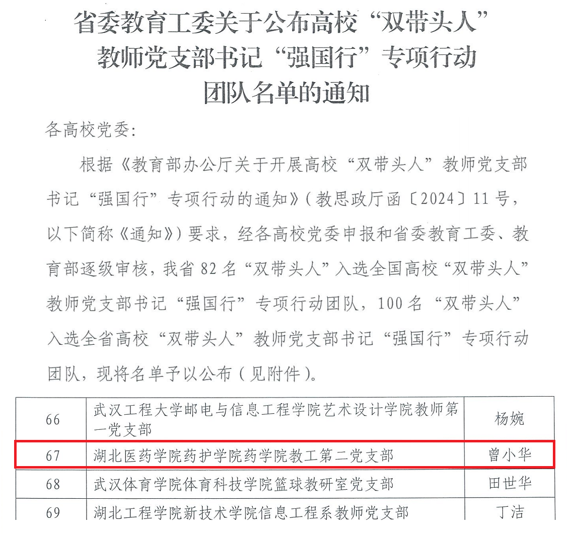 本网讯(通讯员 吴丰旭)近日,中共湖北省委教育工作委员会公布了全省高校“双带头人”教师党支部书记“强国行”专项行动团队名单,我院教工第二党支部成功入选。这是继教工第二党支部先后获得“校级首批‘双带头人’教师党支部书记工作室”、“全省高校‘双带头人’教师党支部书记工作室”后,太阳tyc539党委持续推进新时代高校党建“双创”工作提质创优取得的新成果。