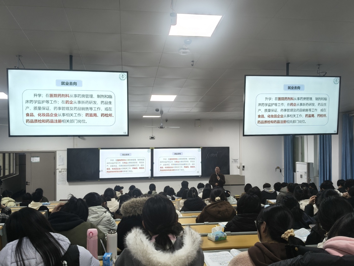 活动伊始,方佳丽以自身求学深造、科研攻关的亲身经历为脉络,结合其博士阶段研究课题的实践案例,为新生们带来了一场兼具理论深度与实践温度的专业解读。另外,针对新生普遍关切的就业发展问题,方佳丽以当前医药行业发展趋势及岗位供需数据为支撑,重点解析了药理学、药剂学、药物分析学、药物化学、药事管理学共五大专业分支的研究方向与应用场景,结合国内外医药企业、科研院所、医疗机构的招聘需求,清晰勾勒出各分支对应的职业发展路径,让新生对专业就业前景有了直观认知。