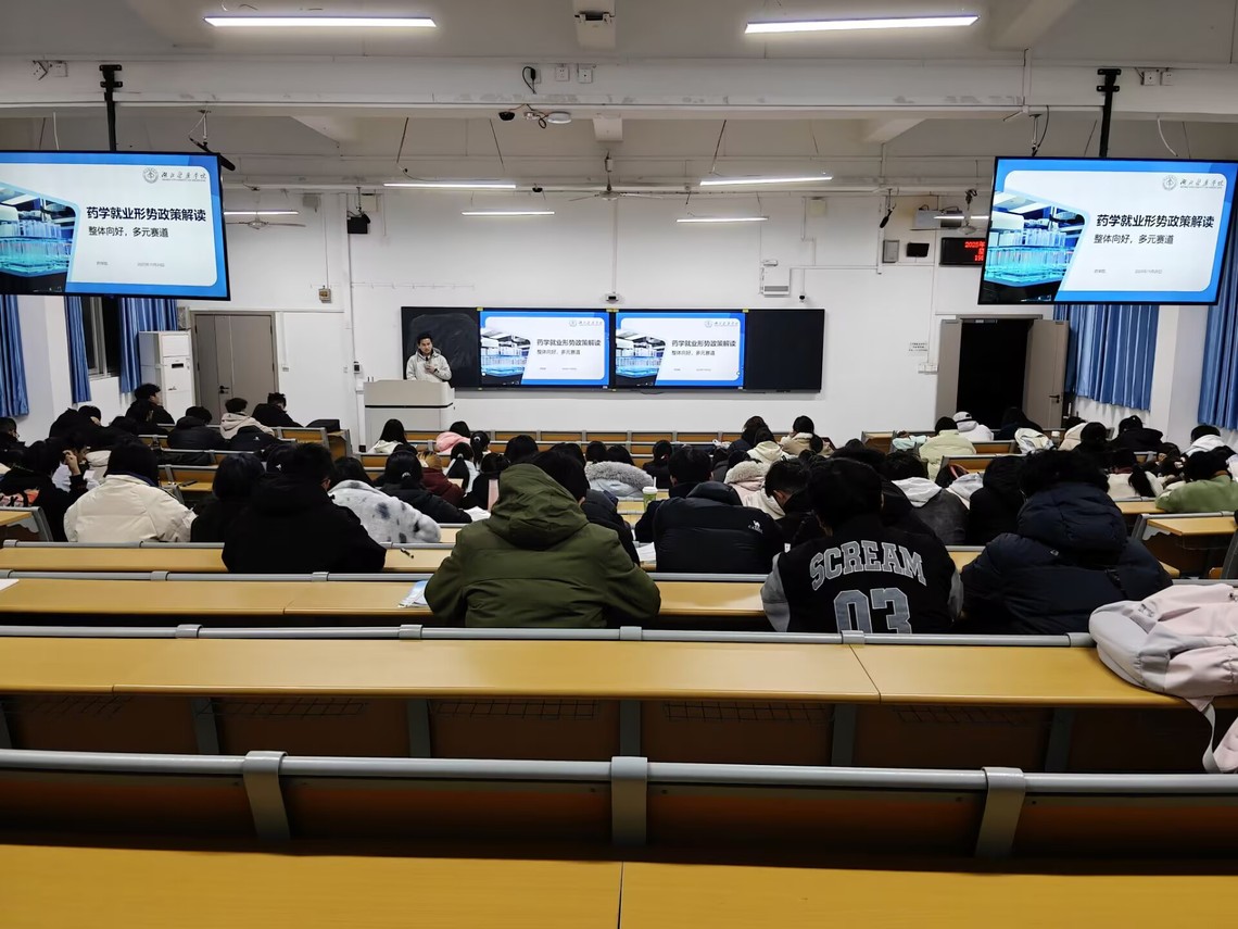 彭红星结合政策与行业数据,指出“健康中国”战略下,药学相关行业呈现“基础岗位稳、高端岗位热”态势,创新药研发等高端赛道人才缺口大,基层药师需求增长,就业机遇与政策红利叠加。详解基层就业学费代偿、编制倾斜,新兴研发领域创业激励等政策,提醒学生通过官方渠道获取权威信息。互动环节,彭红星为同学们答疑解惑,学生反馈通过解读会他们厘清政策要点、明晰发展路径,为职业规划提供精准指引。